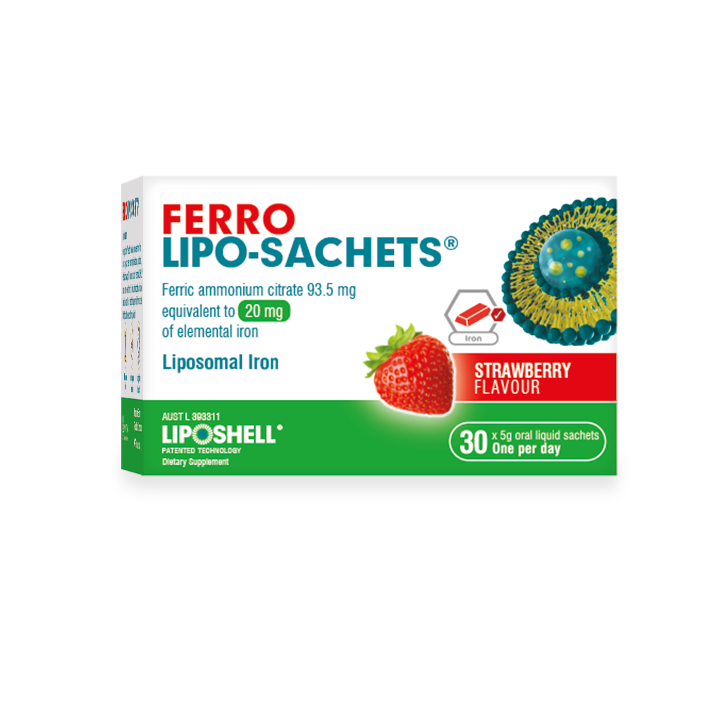 Ferro Lipo-Sachets® provides liposomal iron with superior absorption 1 in a natural strawberry flavour to help enhance energy levels and relieve fatigue.